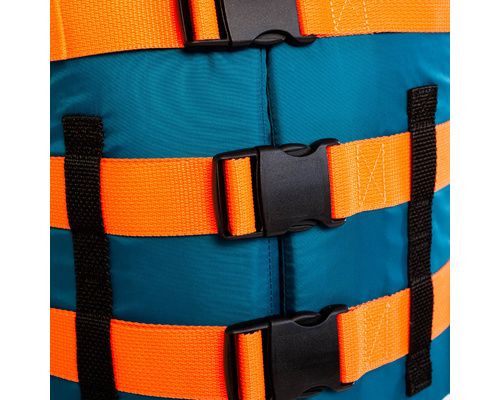 Trois sangles et boucles YKK robustes et réglables permettent au gilet de sauvetage de rester en sécurité autour de votre corps.