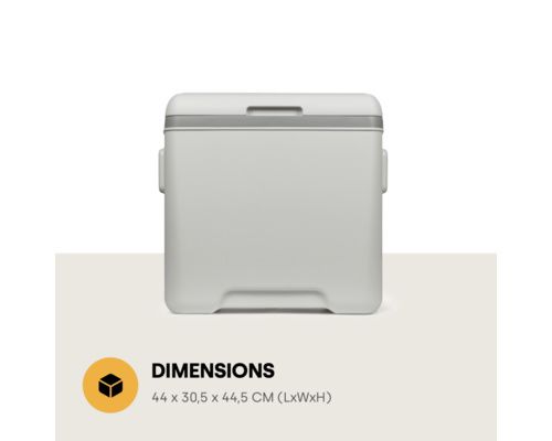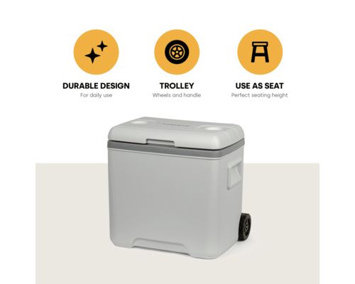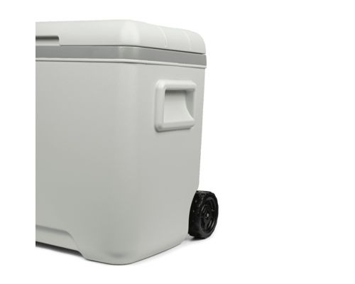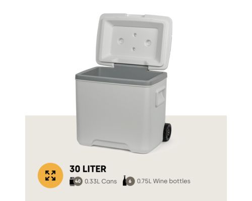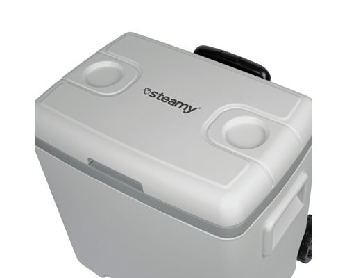 La Steamy Marine 30 Roller est une glacière à roulettes contemporaine et pratique. Grâce à ses roues et à sa poignée extensible, il est facile de la déplacer, même lorsque la glacière de 30 litres est remplie à ras bord. La conception haute permet également de transporter facilement des bouteilles de 1,5 litre debout.