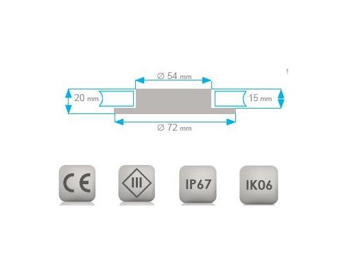 - Dimensions : encastrement 54 millimètres / enjoliveur 72 millimètres / hauteur encastrement 15 millimètres / hauteur totale 20 millimètres