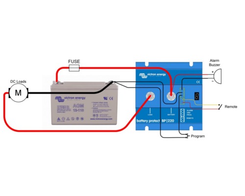- BatteryProtect peut être configurée pour s'activer/se désactiver à différents niveaux de tension. L'écran à 7 segments indiquera quelle configuration a été choisie. Une configuration spéciale pour des batteries au lithium-ion Avec ce mode, le BatteryProtect peut être contrôlé par le BMS du VE-Bus. Remarque: le BatteryProtect peut également être utilisé comme un interrupteur de charge entre un chargeur de batterie et une batterie Li-ion. Voir le schéma de connexion dans le manuel.