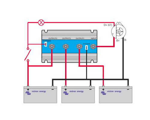 Comme les répartiteurs à diodes classiques, les répartiteurs Argo FET permettent de charger simultanément plusieurs batteries à partir d'un seul alternateur ou chargeur, sans relier ces batteries entre-elles.