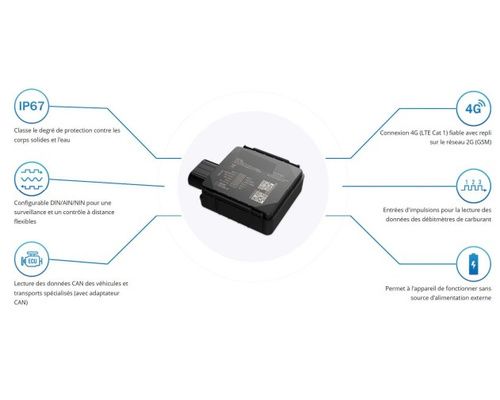Le HIJ230 est un tracker GPS RÉSISTANT À L'EAU (IP67)ET À LA POUSSIÈRE avec une couverture réseau 4G (LTE Cat 1) incluant une compatibilité de secours 2G (GSM).