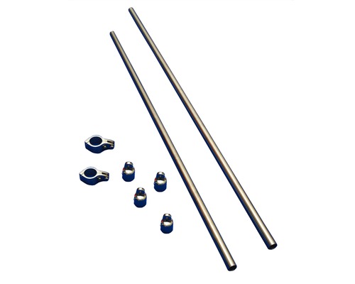 Le kit comprend 2 tubes de 1,35 m (possibilité de les couper à la taille nécessaire) si nécessaire avec 4 bouchons. Les pinces à charnière à fixer au rail ont un diamètre de 32mm avec des inserts en caoutchouc pour les adapter sur des tubes de 25 mm.