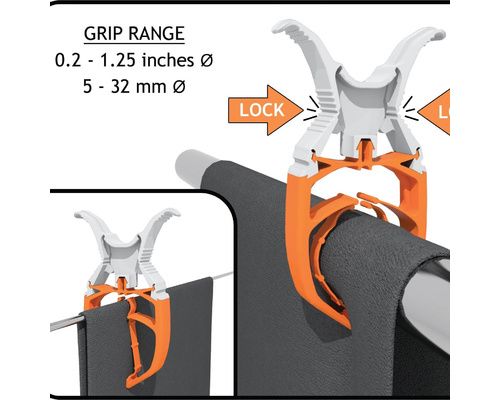 La double genouillère brevetée de FIXCLIP et les bras de friction autobloquants offrent des propriétés uniques de maintien de la prise.