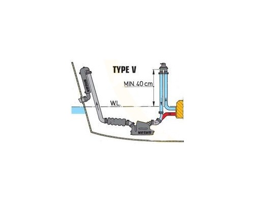 Si le point d’injection de l’eau de refroidissement dans l’échappement est situé à moins de 15 cm au-dessus de la flottaison, il peut se produire, lorsqu’on arrête le moteur, un flux d’eau qui entre dans le moteur, par effet de siphon. On peut éviter ce phénomène en positionnant sur la tuyauterie de refroidissement un coude anti-siphon VETUS, á 40 cm minimum au-dessus de la flottaison.