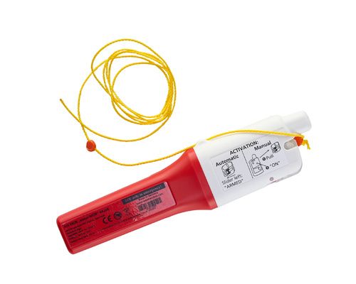 L'émetteur d'urgence ne nécessite aucun outil spécial. Grâce à sa taille compact, il peut être adapté à un vaste éventail de modèles de gilets de sauvetage. Glissez-le tout simplement tête en bas entre deux épaisseurs du gilet de sauvetage, puis attachez le cordon de sécurité au gilet par un nœud, par exemple à un anneau existant.