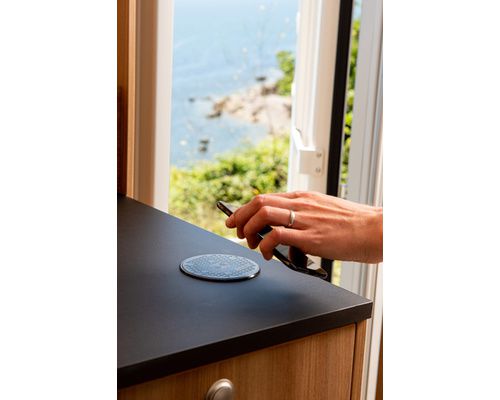 Chargeur de portable sans-fil, étanche et étudié pour être utilisé aussi bien en intérieur qu'à l'extérieur.