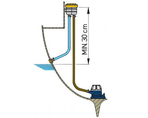 La pompe de cale à utiliser en combinaison, pourra avoir une capacité de 20 litres par minute. Les raccords reçoivent des tuyaux de Ø 19 mm