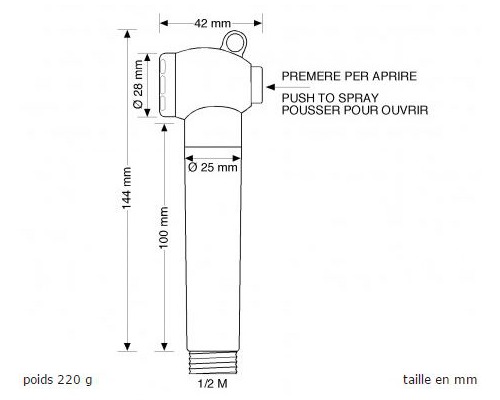 Douchette seule laiton chromée avec bouton poussoir permettant la distribution de l'eau.