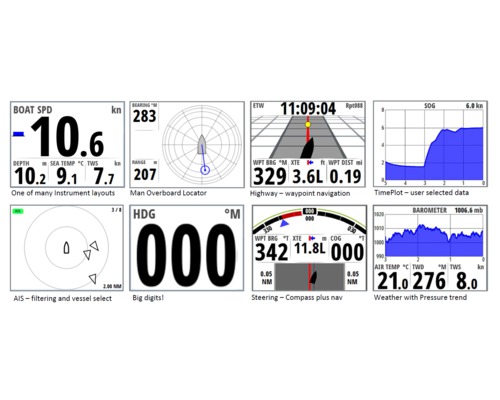 - Affichage du vent, de la vitesse, de la profondeur, du cap, de l'état du pilote automatique, et bien plus encore