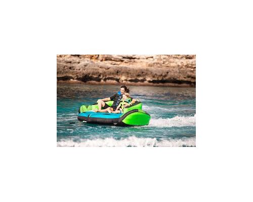 Cette bouée deux personnes comprend quatre chambres à air en PVC très résistant. Pour plus de confort, elle est recouverte d'une housse en nylon 840D avec des pads en néoprène sur les assises. Elle comprend dix poignées en mousse EVA avec néoprène pour les doigts. Pour plus de sensations, cette bouée peut être tractéer dans les deux sens.