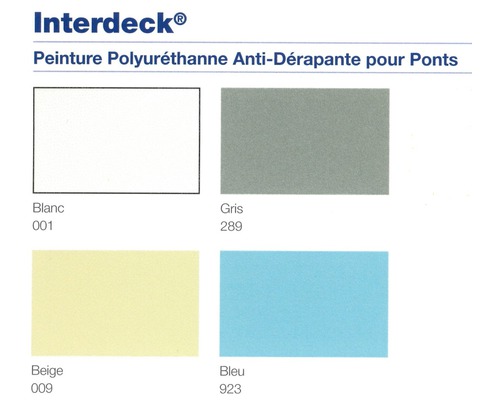 Cette peinture est dédié aux ponts de bateaux. Sa formulation polyuréthane lui confère une finition très dure, résistante aux abrasions courantes à tout pont. D’autre part, toutes les couleurs proposés sont faiblement réfléchissantes afin d’empêcher toute réverbération.
