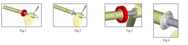 3. Monter le coupe orin, équipé de sa protection (5), sur l’arbre d’hélice (3) en prenant garde au sens du coupe orin (voir les schémas).