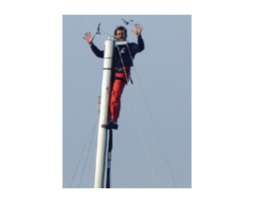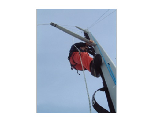 Matériaux souples et accessoires à toutes épreuves : l'échelle de mât est incassable. Équipé du harnais et de l'anti-chute, le navigateur est assuré de ne pas tomber.