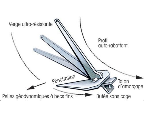 La Britany est la seule ancre plate sans cage d'articulation, d'où aucun risque de blocage de verge dû au bourrage, et une prise instantanée. Construite en acier galvanisé très haute résistance (55 kg d'acier par mm2).