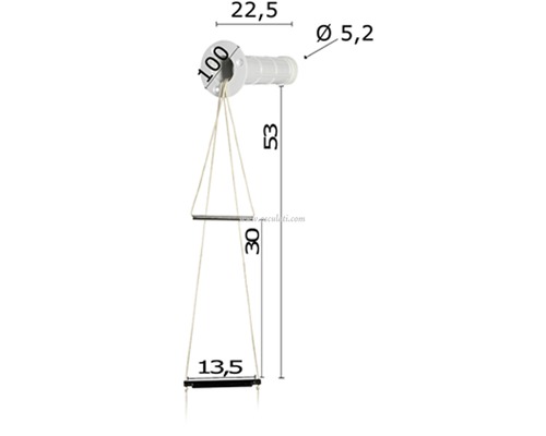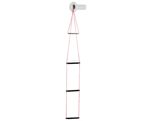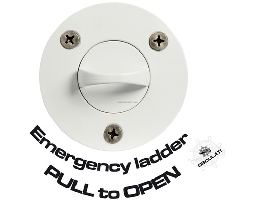 Compartiment étanche en thermo-polymère. Echelle avec montants en tresse nylon et marches en thermo-polymère haute résistance. Installation sur la ligne de flottaison. Très facile à utiliser: la personne à la mer tire l'anneau du bouchon de fermeture et cette operation permet de sortir l'échelle de son compartiment.